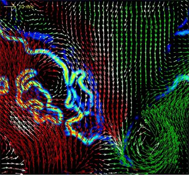 Laserlichtschnittaufnahme der zweidimensionalen Verteilung der Reaktionszonen (blau-gelbe Strukturen) und des Strömungsfeldes (dargestellt durch Pfeile, die Farben grün und rot geben an, ob die Strömung in die Bildebene hinein oder heraus geht), aufgenommen in einer Drallflamme in einer Gasturbinen-Modellbrennkammer.
