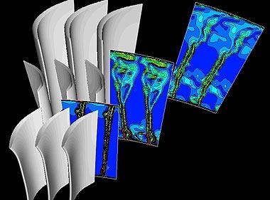 Numerische Simulation des Strömungsverlaufs in einer Triebwerksturbine.