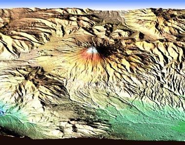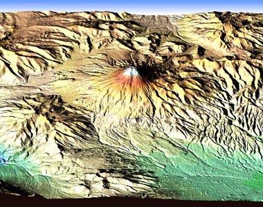 Hochaufgelöste, dreidimensionale SRTM-Aufnahme einer Region der Anden in Ecuador, die schon während Mission, am 19. Februar 2000, vom DLR veröffentlicht wurde. Sie zeigt den 5897 Meter hohen Cotopaxi, einen der höchsten aktiven Vulkane der Erde.