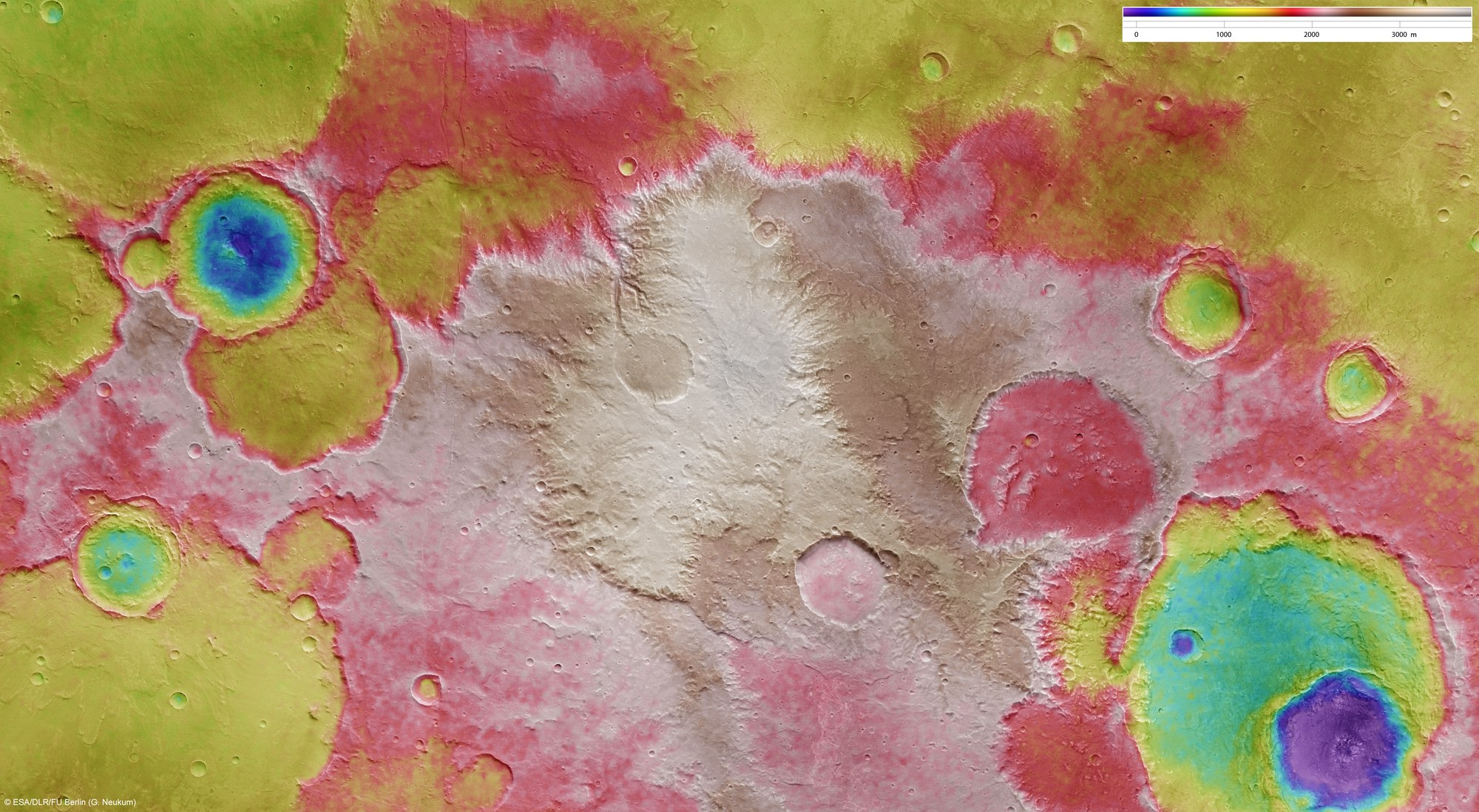 Anhand der farbkodierten Skalierung sieht man, dass sich die blau gekennzeichneten, tiefsten Punkte im Zentrum zweier etwa 20 Kilometer großer Einschlagkrater im Südosten beziehungsweise Nordosten der Szene befinden. Der Höhenwert "null Meter" bezieht sich dabei auf ein Referenzniveau, dem so genannten "Areoid", das auf dem Mars in Ermangelung eines Meeresspiegels - der auf der Erde für Höhenangaben herangezogen wird - verwendet wird.