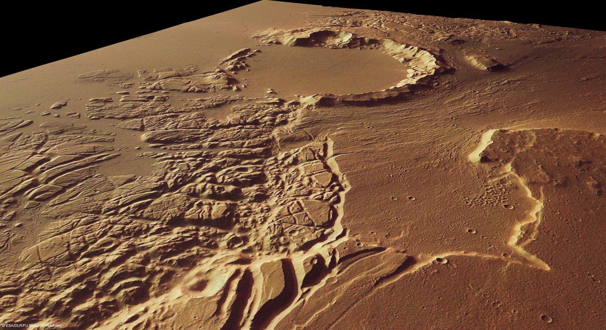 In der rechten Bildhälfte sieht man einen Talabschnitt, in dem entlang der vorherrschenden Windrichtung Erosionsformen entstanden sind. Im Hintergrund in der Bildmitte ist ein alter Einschlagkrater von etwa 35 Kilometern Durchmesser zu sehen, dessen südwestlicher Rand fast vollständig abgetragen wurde. Dadurch konnten sehr dünnflüssige Lavaströme ins Innere des Kraters strömen, die eine vollkommen glatte Ebene erzeugt haben. Wahrscheinlich floss auch Wasser in den Krater.