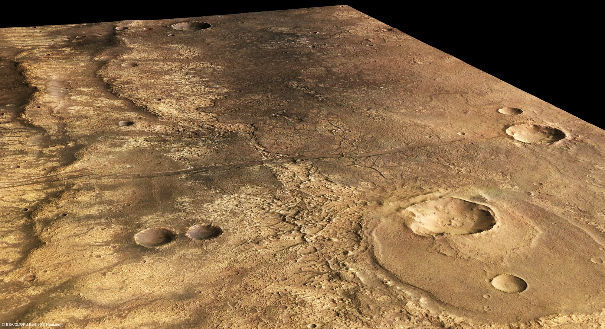 Aus den schräg auf die Oberfläche gerichteten Stereo- und Farbkanälen des Kamerasystems HRSC können realistische, perspektivische Ansichten der Marsoberfläche erzeugt werden. Das Bild zeigt einen Blick von Nordosten nach Südwesten über die Fließfronten von erkalteten Lavaströmen in der Region Ma'adim Vallis im Marshochland.