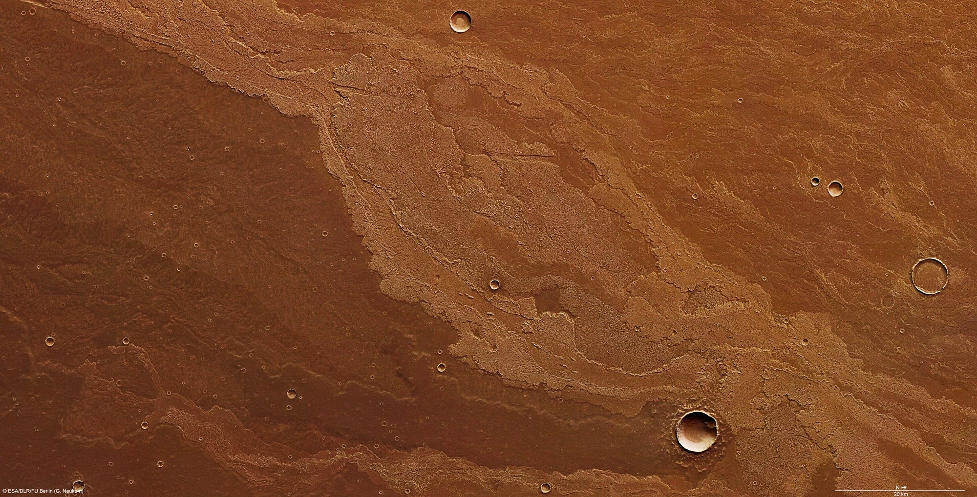 Diese senkrechte Farb-Draufsicht auf ein Gebiet südöstlich des Marsvulkans Arsia Mons in der Region Tharsis wurde aus dem senkrecht nach unten blickenden Nadirkanal und den schräg auf die Oberfläche gerichteten Farbkanälen des Kamerasystems HRSC erstellt; Norden ist rechts im Bild.
