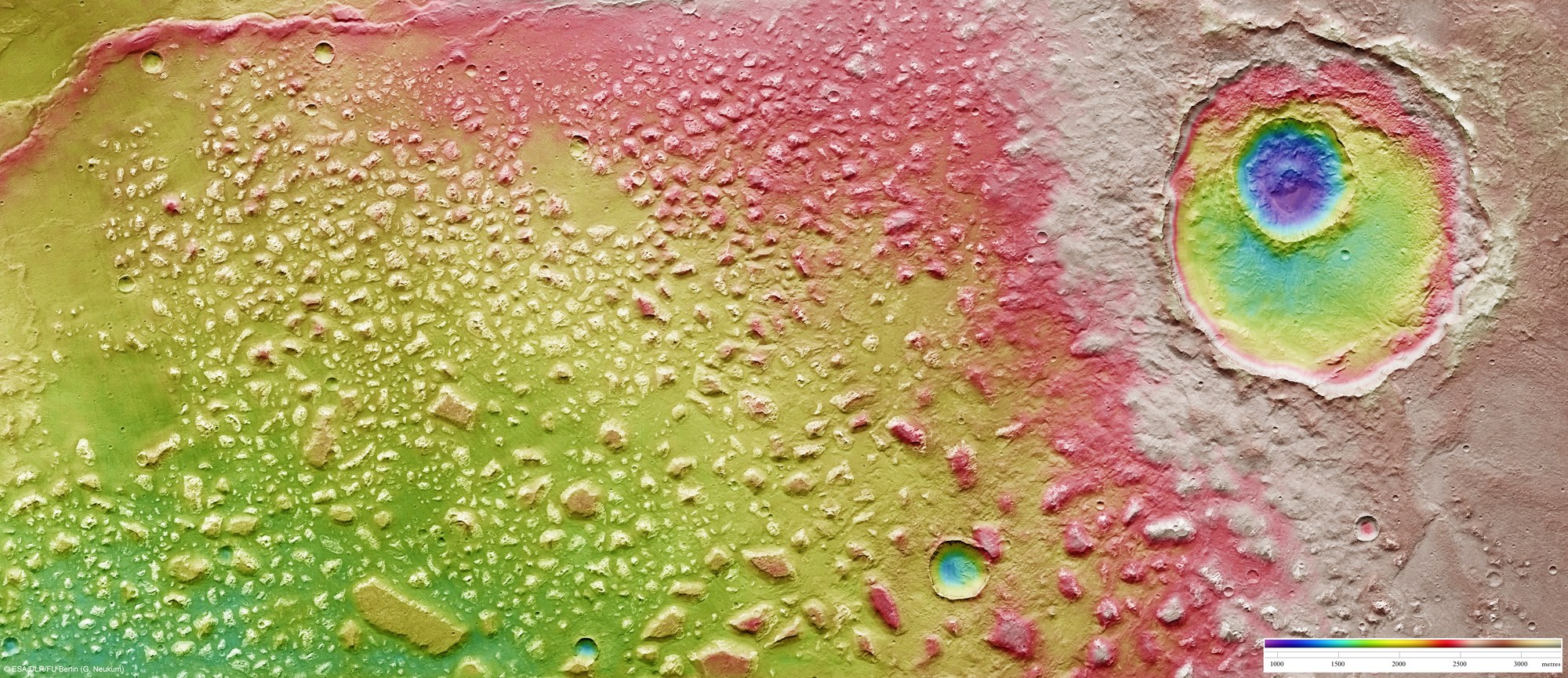 Anhand der farbkodierten Meter-Skalierung (unten rechts) lässt sich ablesen, dass die tafelbergartigen Blöcke in Ariadnes Colles mehrere hundert Meter aus der Ebene herausragen. Das Marshochland im Norden (rechts im Bild) bildet eine mehr als tausend Meter hohe Umrahmung von Ariadnes Colles. Der markante, im Durchmesser etwa 30 Kilometer große Einschlagkrater ist etwa 1200 Meter tief, und der kleinere und jüngere Einschlagkrater in seiner Mitte grub sich weitere tausend Meter tief in das Marshochland und bildet den tiefsten Punkt in der Umgebung.