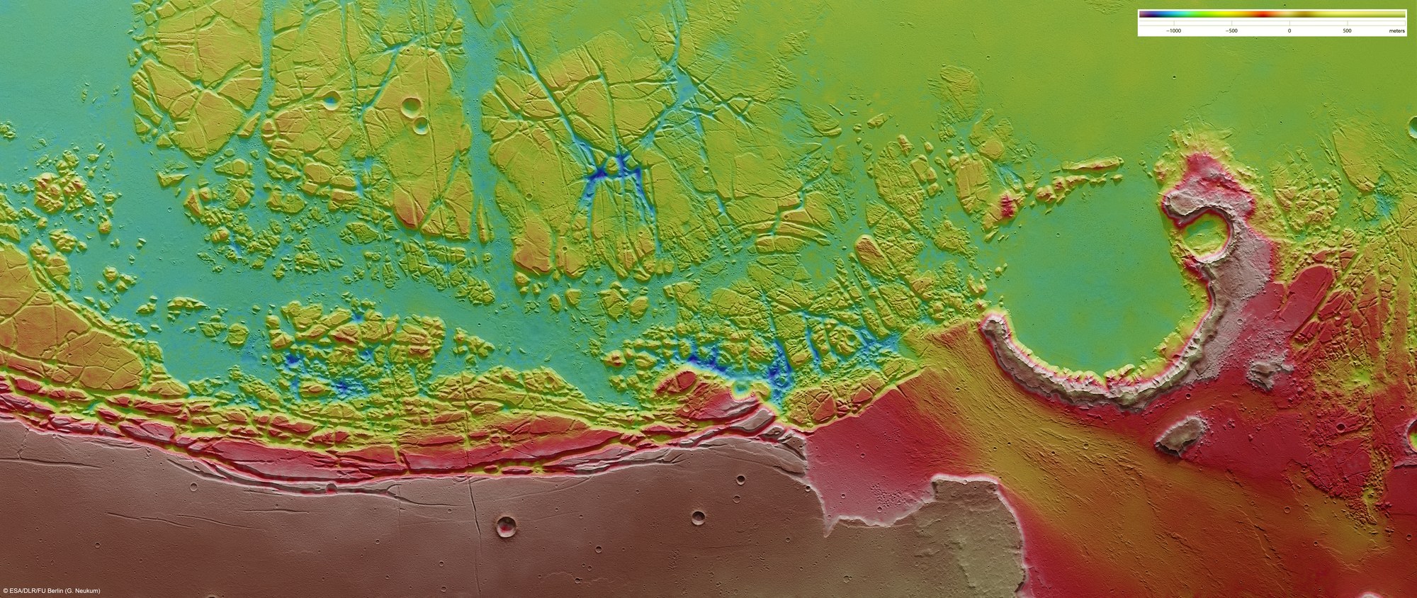 Aus den neun unter verschiedenen Winkeln auf die Planetenoberfläche gerichteten Aufnahmekanälen der Stereokamera HRSC können so genannte digitale Geländemodelle abgeleitet werden, mit denen die Topographie der Landschaft bildhaft dargestellt werden kann. Das Bild zeigt eine Draufsicht auf Sacra Fossae, einer Übergangszone zwischen dem Hochlandgebiet Lunae Planum (entlang des unteren Bildrandes) in das Talsystem Kasei Valles. Norden ist rechts im Bild.