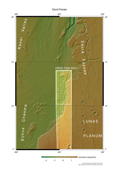 Das Talsystem von Kasei Valles ist eines der größten Ausflusstäler auf dem Mars und erstreckt sich über 3000 Kilometer durch das südliche Marshochland. Die nachfolgend gezeigten Bilder zeigen einen Teil der Sacra Fossae, die den Übergang von der Hochebene Lunae Planum in den über einen Kilometer tiefer gelegenen Talgrund von Kasei bilden.