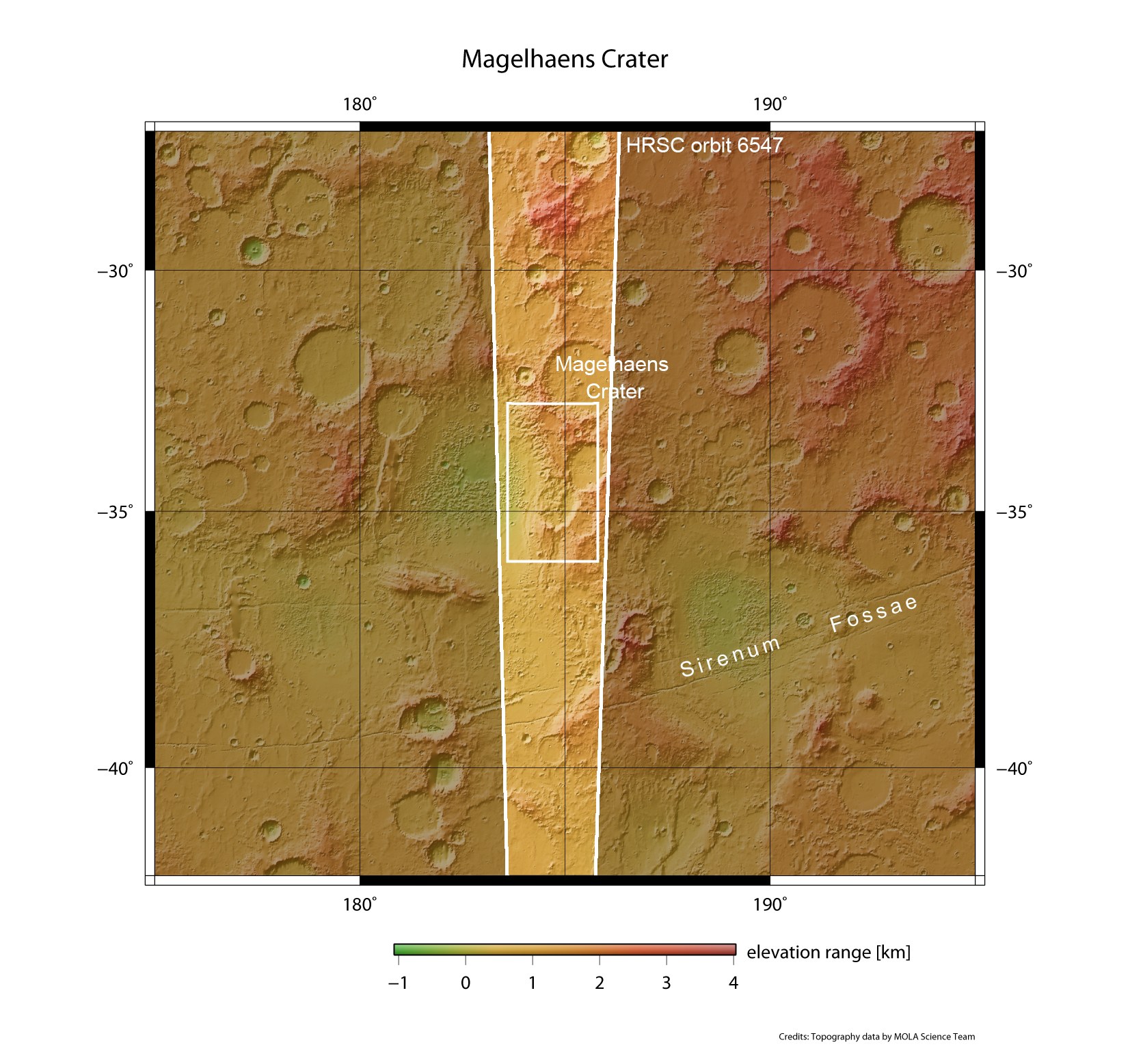 Die hier gezeigte Szene vom Nordrand des Magelhaens-Kraters wurde am 6. Februar 2009 während des Orbits 6547 mit einer Auflösung von circa 25 Metern pro Bildpunkt (Pixel) aus einer Überflughöhe von 500 Kilometern aufgenommen. Die Abbildungen zeigen einen Ausschnitt bei 34 Grad südlicher Breite und 185 Grad östlicher Länge. Mit einer Ausdehnung von zirka 190 Kilometern mal 112 Kilometern erstreckt sich das abgebildete Gebiet über 21.280 Quadratkilometer und ist damit etwa so groß wie Slowenien.