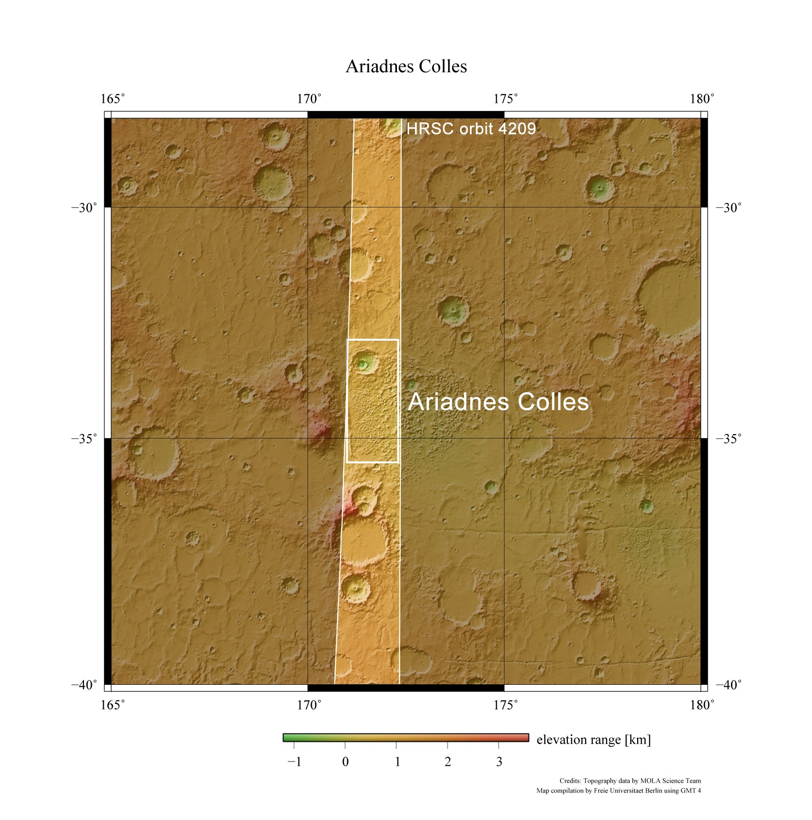 Die hier gezeigten Bilder befinden sich in dem dick umrandeten Gebiet und sind Teil eines langen Bildstreifens, den die vom DLR betriebene hochauflösende Stereokamera HRSC (High Resolution Stereo Camera) mit ihren neun Sensoren während des Überflugs aufgenommen hat (hell markiertes Gebiet). Norden ist oben im Bild.
