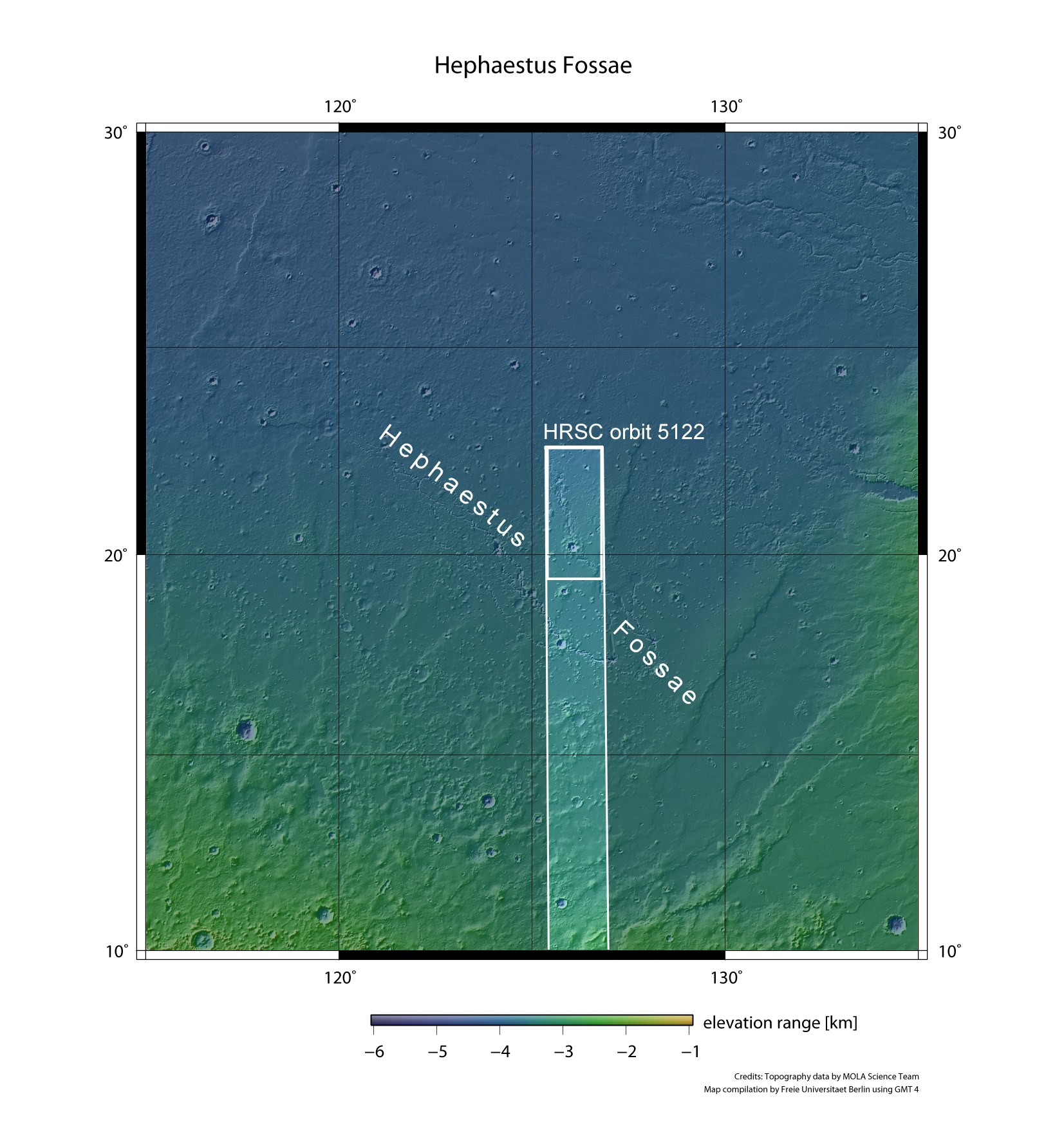 Die folgenden Abbildungen zeigen einen 170 mal 80 Kilometer großen Ausschnitt von Hephaestus Fossae bei 21 Grad nördlicher Breite und 126 Grad östlicher Länge (dick umrandetes Gebiet). Die Bilddaten wurden am 28. Dezember 2007 mit der vom Deutschen Zentrum für Luft- und Raumfahrt (DLR) betriebenen hochauflösenden Stereokamera HRSC während Orbit 5122 von der Sonde Mars Express der europäischen Weltraumorganisation ESA aufgenommen. Das dünn umrandetes Gebiet zeigt den gesamten HRSC-Bildstreifen. Die Bildauflösung beträgt zirka 16 Meter pro Bildpunkt (Pixel). Mit einer Fläche von 13.600 Quadratkilometern ist das abgebildete Gebiet damit ein wenig kleiner als Schleswig-Holstein.