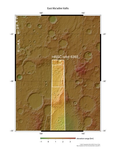 Die Abbildungen zeigen einen südöstlich von Ma'adim Vallis gelegenen Teil der Region, bei 29 Grad südlicher Breite und 182 Grad östlicher Länge (dick umrandetes Gebiet). Das Gebiet wurde mit der vom Deutschen Zentrum für Luft- und Raumfahrt (DLR) betriebenen hochauflösenden Stereokamera HRSC von der ESA-Sonde Mars Express am Heiligabend 2008 im Orbit 6393 aus einer Höhe von etwa 325 Kilometern aufgenommen. Das dünn umrandete Gebiet zeigt den gesamten HRSC-Bildstreifen. Die Bildauflösung beträgt circa 15 Meter pro Bildpunkt (Pixel). Mit einer Fläche von fast zehntausend Quadratkilometern ist das abgebildete Gebiet damit etwa so groß wie die Mittelmeerinsel Zypern.