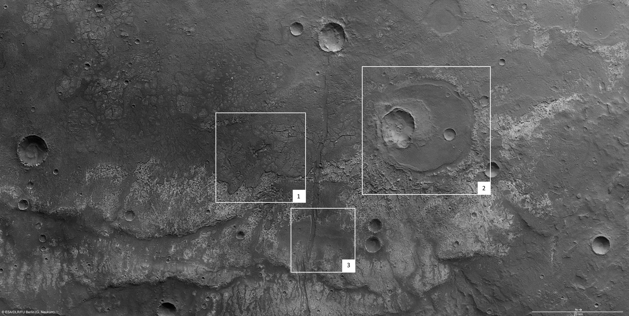 Im nördlichen Teil des Gebietes ist ein etwa 20 Kilometer großer Einschlagkrater zu erkennen (Bildausschnitt 2). Dieser Krater wurde von Lava zu einem großen Teil verfüllt, ist also früher als der Lavastrom entstanden. Später bildete sich durch einen weiteren Einschlag ein kleinerer, etwa sieben Kilometer großer Krater im südlichen Teil des alten Kraters. Dieser kleinere Krater zeigt eine gut zu erkennende Auswurfdecke, die möglicherweise durch wasserhaltiges Material gebildet wurde, das beim Einschlag ausgeworfen wurde und so diese ungewöhnliche Form der Ablagerung erzeugte.