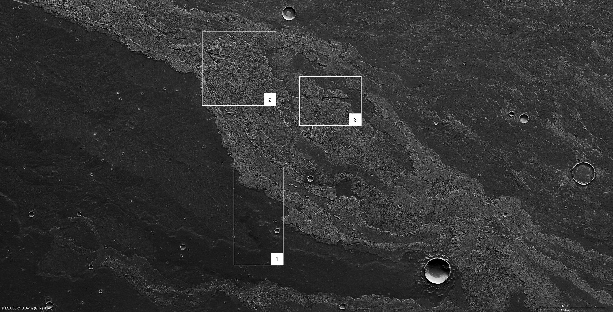Das Gebiet ist von zwei erkalteten Lavaströmen verschiedenen Alters und unterschiedlicher Oberflächenstrukturen geprägt (Bildausschnitt 1), die sich diagonal durch das Bild erstrecken. Die Lava hat ihren Ursprung an der Südflanke des Vulkans Arsia Mons, der sich nordwestlich, außerhalb der gezeigten Szenen befindet. Der jüngere Lavastrom im oberen Teil des Bildausschnitts zeigt deutliche Fließstrukturen, wie zum Beispiel einen Lavakanal oder so genannte "Druckrücken". Diese entstehen, wenn die Lava an den Rändern oder auf der Oberfläche zu erstarren beginnt, unter der erkalteten Decke aber noch fließfähig ist, dadurch die Kruste zu Runzeln zusammenschiebt und aufwölbt. Im Gegensatz dazu ist ein deutlich älterer Lavastrom in der unteren Hälfte dieses Bildausschnitts zu sehen. Darauf sind mehr Einschlagkrater zu erkennen, und die Oberfläche erscheint glatter, weil sich im Laufe der Zeit darauf Sand und Staub abgelagert haben.