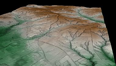 Auf diesem in klassischen Atlasfarben kolorierten TanDEM-X-Höhenmodell ist die Region am russischen Fluss Don bei Kalasch zu sehen. Das Modell ist stark überhöht, der gezeigte Landschaftsausschnitt hat in Wirklichkeit einen Höhenunterschied von zirka 200 Metern. Durch die hohe Auflösung der Daten sind auf dem Bild nicht nur Täler und Hochflächen zu erkennen, sondern auch Straßen und Feldergrenzen.