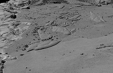 In der Bildmitte dieser TanDEM-Aufnahme sind Eisschollen im gefrorenen Meereis vor der Küste der Oktoberrevolutions-Insel zu erkennen. Sie ragen etwa drei bis zehn Meter über die Meereisfläche. Die glatten Strukturen am linken Bildrand zeigen die felsige Küste der Oktoberrevolutions-Insel. Ganz im Hintergrund, rechts und links von einem größeren Felsbrocken, sind zwei Gletscherzungen zu sehen, die an dieser Stelle ins Meer münden.