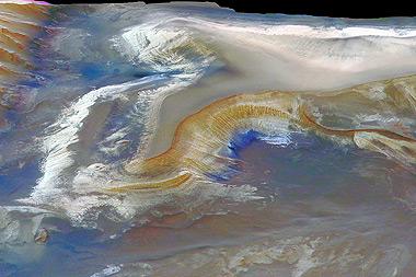 Auf dem Bild ist ausgedehntes Kieserit, ein hydratisiertes Magnesium-Sulfat-Salz, zu sehen. Hydratisiert bedeutet, dass Wassermoleküle in die Kristallstruktur eingebaut sind. Kieserit bildet die hellen Flächen an den Hängen im westlichen Candor Chasma, einer der größten Schluchten in den "Mariner-Tälern" (Valles Marineris) auf dem Mars. Die Valles Marineris erstrecken sich über 4.000 Kilometer von Westen nach Osten entlang des Mars-Äquators.