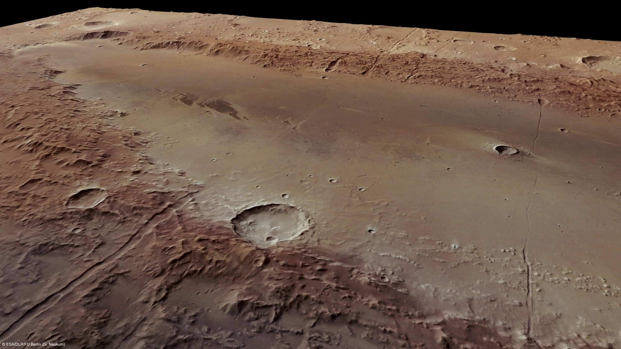 Aus den schräg auf die Oberfläche gerichteten Stereo- und Farbkanälen des Kamerasystems HRSC können realistische, perspektivische Ansichten der Marsoberfläche erzeugt werden. Das Bild zeigt einen Blick vom Westrand über die hier etwa 140 Kilometer breite Struktur Orcus Patera.
