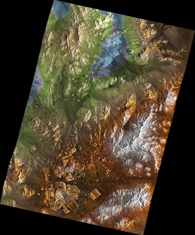 Kupfermine in Chile: Auf diesem TanDEM-X-Höhenmodell ist unten die rund 400 Meter tiefe Grube der "Minera Escondida" zu erkennen. Das abgetragene Gestein wurde nach der Extraktion des Rohstoffs ringsherum in länglichen Halden abgelagert, bis zu einer Höhe von etwa 100 Metern. Teile der Infrastruktur, wie etwa Klärbecken zur Reinigung des Wassers, sind als rechteckige Flächen im Abbaugebiet zu erkennen.