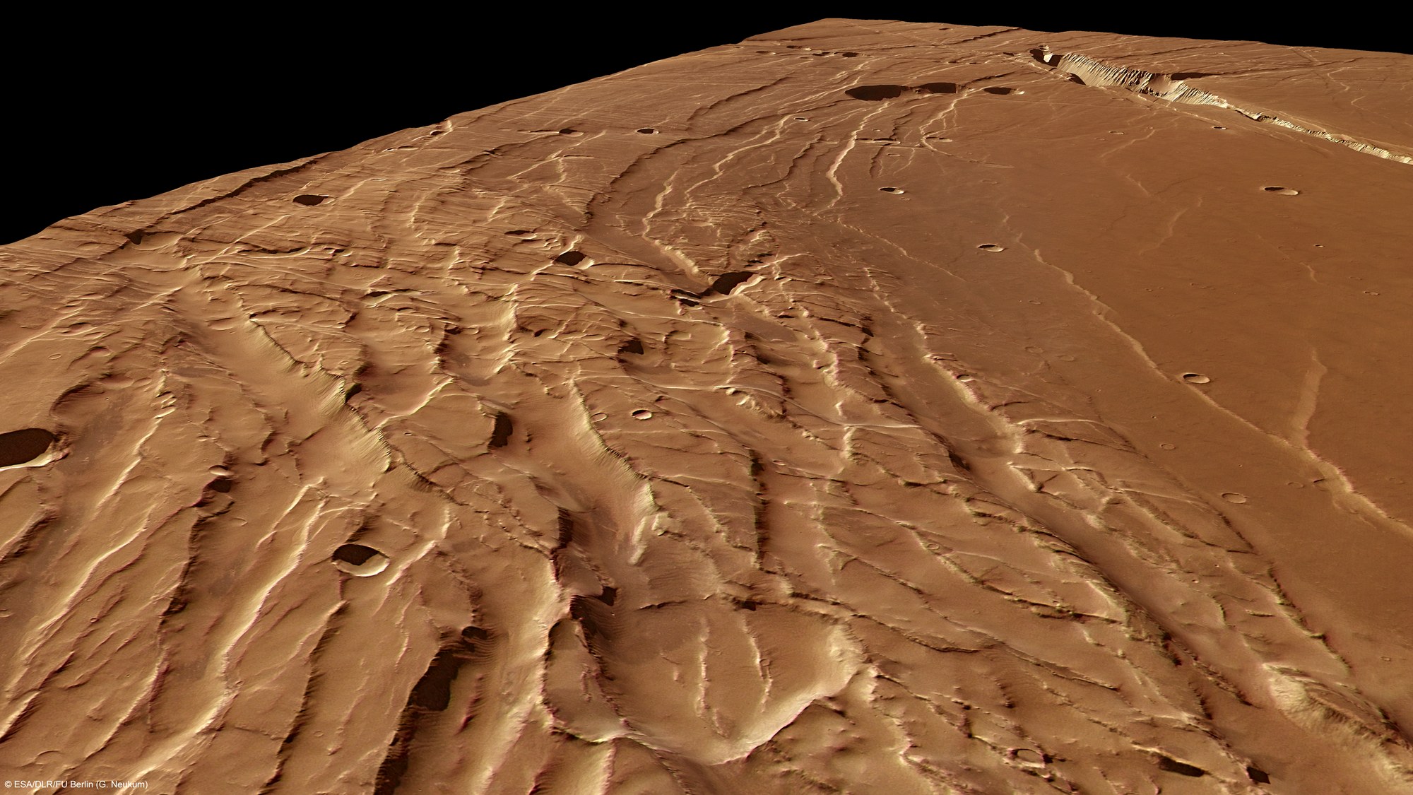 Aus den schräg auf die Oberfläche gerichteten Stereo- und Farbkanälen des Kamerasystems HRSC auf Mars Express können realistische, perspektivische Ansichten der Marsoberfläche erzeugt werden. Das Bild zeigt einen Blick von Südosten in Richtung Nordwesten über Bruchstrukturen in Phoenicis Lacus im Tharsis-Hochland.