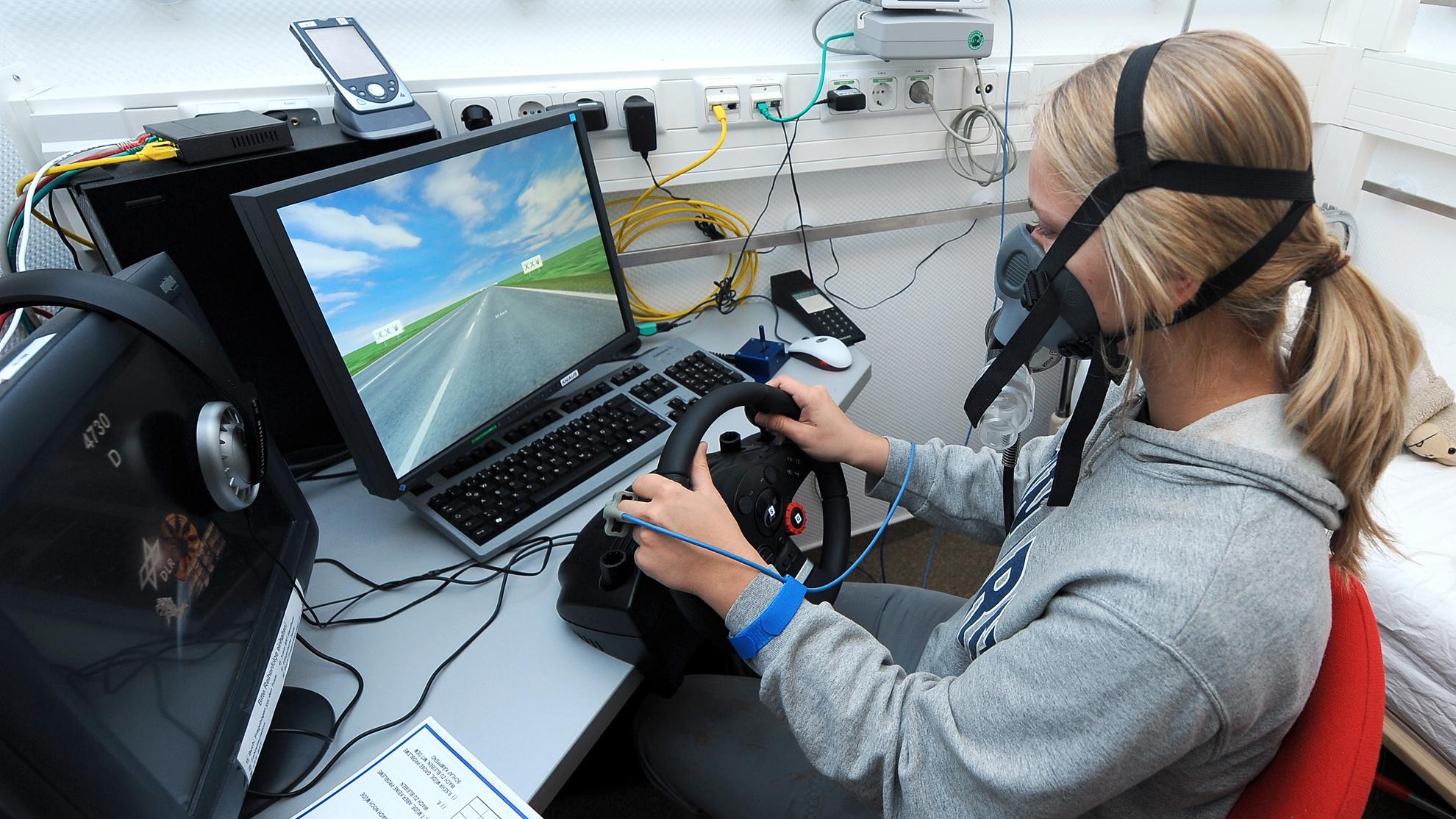 Probandin Julia Rahn trägt bei ihren Leistungstests eine Sauerstoffmaske. Auf diese Weise ändern die Wissenschaftler des DLR den Sauerstoffgehalt - und somit die Testbedingung für die FIT-Studie im Schlaflabor. Während der zwölftägigen Studie sind Wach- und Schlafzeiten genau vorgeschrieben.