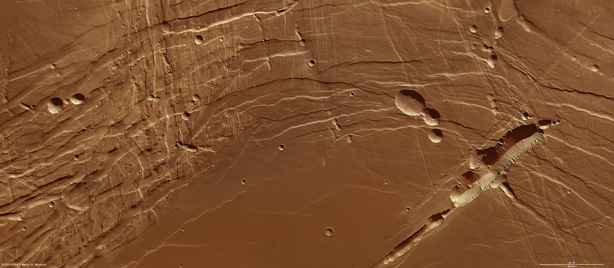 Trotz der monotonen Färbung der Marsoberfläche lassen sich bei starker Vergrößerung kleine Variationen in der Oberflächenbeschaffenheit unterscheiden. Vor allem aber treten die markanten Bruchstrukturen mehrerer Generationen von Störungszonen in dieser Region durch ihren erhöhten Kontrast hervor.