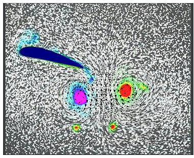 Einzelbildpaar der Strömung hinter einem Flügel, aufgenommen ca. 1928: Überlagert mit einer Falschfarbendarstellung lässt sich die Wirbelstärke mit der modernen Messtechnik PIV darstellen. Ludwig Prandtl fertigte die Filme als Anschauungsmaterial in den 20er und 30er Jahren im Kaiser-Wilhelm-Institut für Strömungsforschung, dem heutigen Max-Planck-Institut für Dynamik und Selbstorganisation, an.