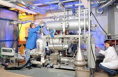 Das Bild zeigt eine 10 Kilowatt-Versuchanlage für die Untersuchung unterschiedlicher Wärmespeicher bis 400 Grad Celsius. Im Vordergrund (rechts) ist der Thermoölkreislauf zu erkennen, der für die Wärmezufuhr beziehungsweise -abfuhr beim Laden und Entladen des Speichers benötigt wird. Der Speicherbehälter (im Hintergrund links) ist ein 100 Liter-Zylinder mit externer Isolierung und kann mit unterschiedlichen Speichermedien betrieben werden.
