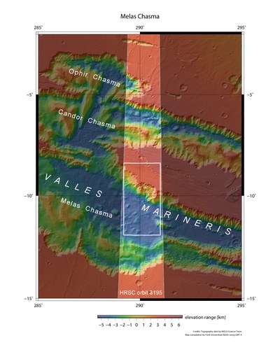 Melas Chasma wird der zentrale, südliche Teil des Hauptgrabens der Valles Marineris genannt, einem fast viertausend Kilometer langen System von Dehnungsbrüchen entlang des Marsäquators. Die ESA-Sonde Mars Express überflog diesen Teil der Valles Marineris entlang des 290. östlichen Längengrades am 6. Juli 2006 während Orbit 3195; die in dieser Bildveröffentlichung gezeigten Szenen entstammen dem dick umrandeten Rechteck; Norden ist oben. Die topographische Karte zeigt farbkodiert die Höhen der Marslandschaft. Die Höhenangaben (Farbskala am unteren Bildrand) beziehen sich auf einen Referenzkörper, den so genannten Areoid (nach Ares, griechisch für Mars), der in Ermangelung eines Meeresspiegels verwendet wird.