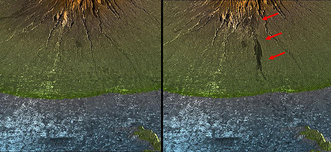 Vergleich der bistatischen DEMs des Merapi auf Java/Indonesien mit der Radarhelligkeit auf den Höhendaten (Farben). Links das DEM vor den letzten Ausbrüchen, rechts die neue Aufnahme.