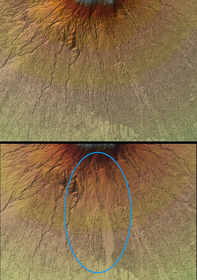 Vergleich der farbkodierten Höhendaten des Merapi. Oben: das DEM vor den letzten Ausbrüchen. Unten die neue Aufnahme. Bilder: DLR
