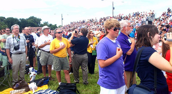 Als der Countdown schon auf 31 Sekunden heruntergezählt war, stand plötzlich die 31 auf der großen Anzeigetafel - aber die 30 kam nicht mehr. Fragende Gesichter allerorten. Abbruch? War das Wetter doch zu schlecht? Ein technischer Defekt? Die wenigsten verstanden die Live-Übertragung aus der Missionskontrolle durch die aufgestellten Lautsprecher. Die Stimmen klangen besorgt, aber unaufgeregt, wie Spezialisten eben klingen, wenn sie etwas Technisches analysieren. Am Shuttle, so wurde uns später gesagt, war alles in Ordnung, aber bei der Überwachung mit den externen Kameras war nicht ganz klar, ob die Haltearme wirklich vom Shuttle weggefahren waren. Die Lage wurde wohl schnell als unkritisch bewertet und die Situation als o.k. eingestuft. Riesenjubel, als die 31 auf einmal auf die 30 sprang, dann auf 29 und 28. Vielleicht hatte es ja geholfen, dass die Amerikaner wenige Minuten zuvor voller Inbrunst und mit der Hand auf dem Herzen ihre Nationalhymne in den heißen Sommerhimmel Floridas geschmettert hatten… aber zunächst hält man erst mal die Luft an.