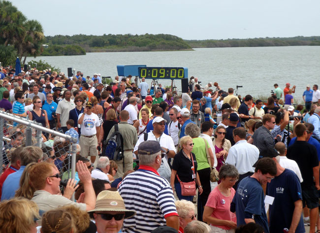 Früh um sechs am Freitagmorgen - es hatte aufgehört zu regnen, aber der Himmel war weiterhin bedeckt - ging es mit dem Bus in Richtung Kennedy Space Center auf der Inselwelt von Cape Canaveral. Fünf Kilometer Stau vor dem Eingangstor. Fast 25.000 seit Monaten angemeldete Besucher ließ die NASA auf ihr Gelände, im Fernsehen sprachen sie von einer Million Zuschauer außerhalb entlang der Straßen südlich und westlich des Capes.