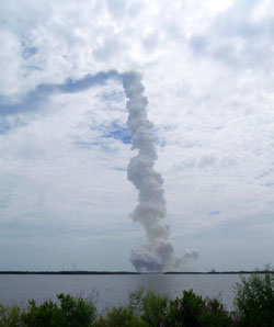 Dann ging's ganz schnell: Der Startkomplex ist im wahrsten Sinne des Wortes meilenweit weg (geschätzte fünf Kilometer), und die Besucher müssen schon die Augen zusammen kneifen, um das Geschehen mitverfolgen zu können. Trotzdem kann man alles gut erkennen. Nie war mein gutes altes Fernglas wertvoller! Bei Ablauf des Countdowns schießen zunächst gewaltige Dampfwolken von unzähligen Kubikmetern eingesprühten Kühlwassers an der Basis des Startkomplex' in turbulentem Chaos viele hundert Meter weit seitlich heraus. Nach einer riesigen, lautlosen Explosion sieht das aus, weil der Schall ja erst in ein paar Sekunden auf der anderen Seite des Banana Creek, einem Lagunenarm auf dem 500 Quadratkilometer großen Gelände der NASA, der uns vom Startplatz trennt, eintreffen wird, wo wir mit Tausenden anderen Gästen der NASA das Spektakel beobachten. Bevor es laut wird, sieht man aber erst "in Echtzeit" den Feuerstrahl, zunächst als Pünktchen durch die Stahlkonstruktion von Startkomplex 39-B, dann erhebt sich auf diesem kleinen orangefarbenen Fleck der Shuttle aus seiner letzten Verankerung, der Feuerfleck dehnt sich zu einem immer länger werdenden schlanken Strahl aus, auf dem sich das ganze System aus Orbiter, Feststoff-Boostern und dem riesigen externen Flüssigtreibstoff-Tank langsam nach oben schiebt, schließlich aus dem Startkomplex herausschießt und sich wie eine mythische Leuchterscheinung über dem Banana Creek erhebt. Ja, Wahnsinn! Jetzt wird das ganze System "zur Rakete", so, wie man sich das als Kind immer vorgestellt hat: In kürzester Zeit wird der Shuttle auf immer höher werdende Geschwindigkeiten beschleunigt und jagt nun rasend schnell auf seinem Feuerstrahl, vielleicht doppelt so lang, wie der 60 Meter hohe Raumgleiter selbst, fffffft, senkrecht in den Himmel.