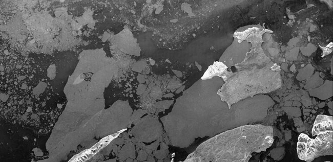 Meereis vor der Küste Grönlands: Diese Datenaufzeichnung von TanDEM-X erfolgte am 2. August 2010 im ScanSAR-Modus mit 100 Kilometern Streifenbreite. Bild: DLR.