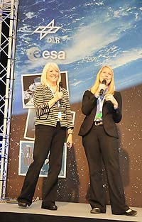Oben: Autogramm für den jüngsten SpaceTweetup-Gast - rechts: Beth Beck und Stephanie Schierholz stellen die Social Media-Kommunikation der NASA vor. (Fotos: ESA)