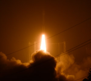 Bild unten: Start der zweiten Vega-Trägerrakete vom europäischen Weltraumbahnhof in Kourou.