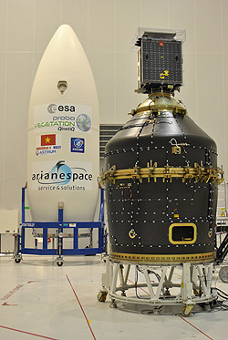 Bild mitte: Satellit PROBA-V - hier auf auf VESPA montiert - soll die Vegetation auf der Erde beobachten.