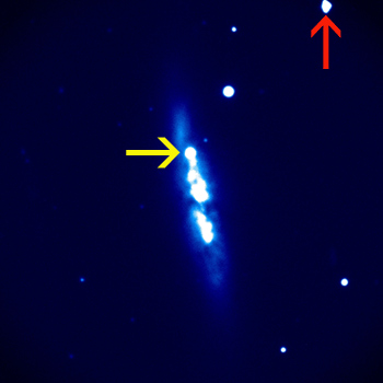 Die Nachführkameras des SOFIA-Teleskops dienen dazu, ausgewählten Leitsternen zu folgen, das heißt die Erddrehung zu kompensieren und Korrektursignale für das Gyrosystem des Teleskops zum Ausgleich der Gyrodrift zu liefern. Hierzu werden geeignete Sterne ausgesucht, die sich im Gesichtsfeld der mit den Infrarot-empfindlichen SOFIA-Instrumenten zu beobachtenden interstellaren Gaswolken befinden. Der Focal Plane Imager FPI - eine Kamera in der Fokalebene des Teleskops - erhält sein Licht über den SOFIA-Primärspiegel von 2,5 m Durchmesser, den Sekundärspiegel und die beiden Tertiärspiegel. Der visuelle Anteil des Lichts durchdringt den ersten Tertiärspiegel und wird vom zweiten Tertiärspiegel auf den FPI umgelenkt. Die Belichtungszeiten können zwischen 1 und 10.000 Millisekunden gewählt werden, so dass sich noch Sterne unterhalb der 16. Größenklasse detektieren lassen. Zur Nachführung werden typische Belichtungszeiten von einer Sekunde verwendet. Das beigefügte Bild zeigt die Supernova in M82 (gelber Pfeil) bei einer Belichtungszeit von einer Sekunde, aufgenommen mit dem FPI über den SOFIA-Primärspiegel.
