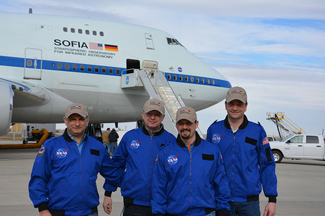 4. Februar 2014: Die deutschen Lehrer vor SOFIA im NASA-Betriebszentrum in Palmdale, Kalifornien, von links): Olaf Hofschulz, Uwe Schierhorn, Jörg Dewitz und Sven Hannsen.