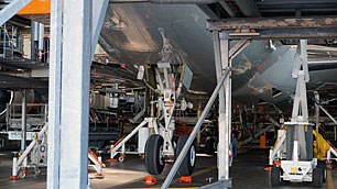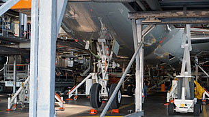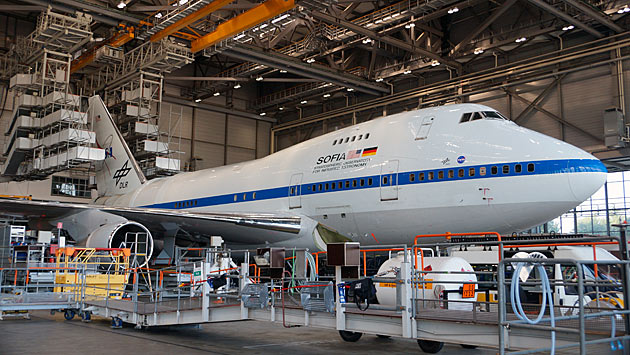 Dazu wurde SOFIA "aufgebockt" und dann so eingerüstet, dass alle Oberflächen des Flugzeugs und die Türen leicht zu erreichen sind.