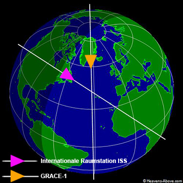 Um 10:47 UTC wird die Internationale Raumstation ISS knapp von GRACE1 (Gravity Recovery And Climate Experiment) passiert werden! "Allzu nahe" werden sich die Raumfahrzeuge dabei dennoch nicht kommen: Im übertragen-romantischen Sinn schon einmal gar nicht, denn GRACE1 hat bereits einen Partner, GRACE2, der ihm in einem Abstand von circa 240 Kilometern vorausfliegt - was den beiden bei uns die Spitznamen "Tom und Jerry" eingebracht hat. Und im physikalischen Sinn wird es auch nichts mit einem allzu engen Kontakt: Denn die amerikanische Weltraumbehörde NASA überwacht streng, wer oder was da mit der ISS potentiell "anbandeln" könnte: Im Zweifelsfall weicht die ISS aus - was dramatischer klingt, als es ist: Meist reicht eine gut dosierte Beschleunigung der ISS an einem definierten Bahnpunkt, um die Bahn derart zu ändern, dass eine Kollision ausgeschlossen ist.