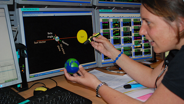 Dann tastet sich die ISS - bildhaft gesprochen - auf ihrer Bahn um die Erde immer sehr nahe an der Tag-Nacht-Grenze entlang und tritt praktisch nie in die Erdschatten auf der sonnenabgewandten Seite ein: Sie ist dann kontinuierlich der Sonneneinstrahlung ausgesetzt. Laura veranschaulicht es mir mit einer Modellerde und einem Textmarker als Sonnenstrahl.