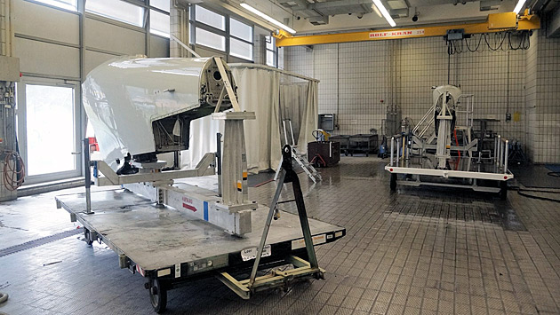 Außerhalb der Kabine sieht es nicht viel anders aus. Die Triebwerke und deren Aufhängungen wurden abgebaut, sie werden neben dem Flugzeug gewartet. Vor der Wartung wurden die Aufhängungen allerdings erst mal gereinigt. Die Lufthansa Technik AG hat eine spezielle "Waschküche" für Flugzeugteile.