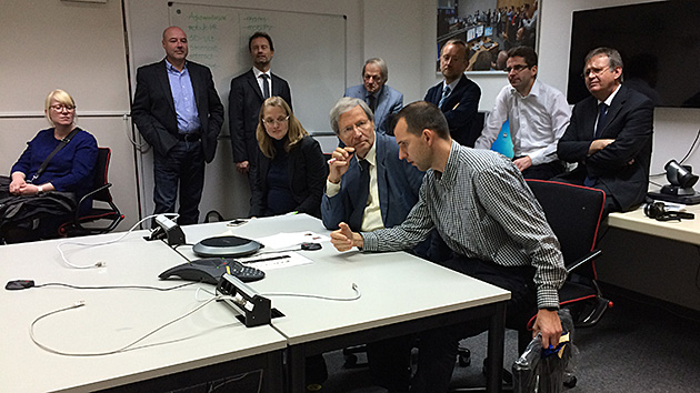 So klingelt kurz vor der Konferenz mit Sergei plötzlich das Telefon in der Mitte des Raumes, auf das sich schon von Anfang an alle Blicke gerichtet haben. Ein kurzes formales "Hello, this is Houston Voice, are you ready for your conference?", dann erstmal Stille. Maksims koordiniert mit unserem Flugdirektor das Einschalten der Columbus-eigenen Kamera. Kurz darauf fliegt Sergei ins Bild – ein kurzes Knacken in der Telefonleitung, als diese mit dem ISS-Funkkanal zusammengepatcht wird – und wir sind mit dem All verbunden.