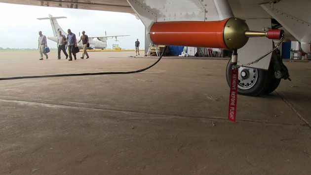 Die Temperaturen liegen mittlerweile bei über 30 Grad. Die Luftfeuchtigkeit legt sich wie eine zweite Haut auf den Körper. Die Piloten besteigen das Cockpit. Die Hilfsturbinen werden angelassen, sie versorgen die wissenschaftlichen Geräte - und ganz wichtig: die Klimatisierung - wieder mit Strom.