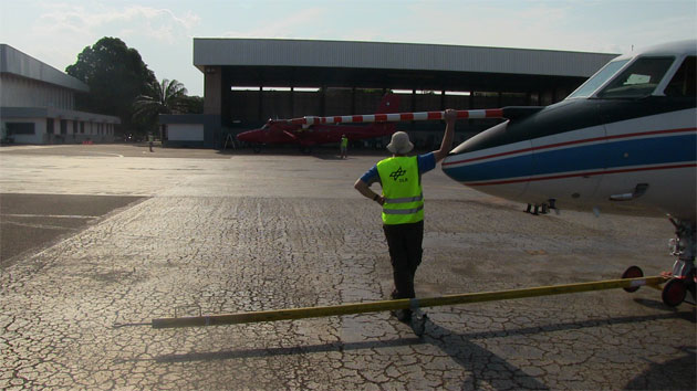 Dreieinhalb Stunden später landet die Falcon wieder am Flughafen Gnassingbé Eyadéma. Nach dem Tanken und getaner Arbeit wird die Falcon wieder in den Hangar geschleppt.
