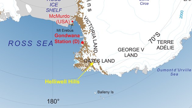 Nach einer ersten Erkundung der Helliwell Hills (Blogeintrag vom 12.01.2016) hatten wir in den letzten Tagen ausgiebig Gelegenheit, die Umgebung des Lagers weiter zu untersuchen. Das Wetter war ideal dafür, denn wir hatten wenig Wind, viel Sonnenschein und angenehme Temperaturen. Der Wetterbericht, der jeden Tag von der Mario Zucchelli-Station durchgegeben wird, gibt Maximaltemperaturen von etwa minus fünf Grad Celsius an, die sich bei der geringen Luftfeuchtigkeit (20 bis 40 Prozent) durchaus nicht kalt anfühlen. Das sind beste Bedingungen, um längere Zeit an einer Stelle im Freien zu arbeiten.