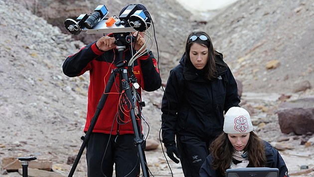 Die Aufnahmeobjekte waren verwitterte Sandsteine, in denen Jean-Pierre verschiedene mikroskopisch kleine Lebensformen gefunden hatte. Einem ungeschulten Auge fallen sie kaum auf, die Landschaft erscheint absolut leblos. Dennoch finden einige Cyanobakterien, also Blaualgen, sowie Flechten und Pilze in Gesteinshohlräumen und Spalten Nischen, in denen sie wachsen können. Die Aufnahmen mit dem Kamerasystem liefern sowohl den Kontext und dreidimensionale Informationen als auch hochauflösende Details. Mit ihrer Hilfe wollen wir lernen, wie man im Gelände vielversprechende Stellen (nämlich die Mikro-Nischen, in denen die Organismen siedeln) identifiziert, um sie mit anderen Instrumenten genauer zu untersuchen und Proben zu nehmen. Genau diese Aufgabe wird sich uns nämlich stellen, wenn wir mit robotischen Rovern und ihrer wissenschaftlichen Nutzlast auf dem Mars nach Lebensspuren suchen. Die ExoMars-Mission der ESA wird eben dieses Ziel haben, und obwohl sie erst in einigen Jahren starten wird, müssen wir die Routinen jetzt schon entwickeln, damit sie uns bis zum Zeitpunkt der Untersuchungen auf der Marsoberfläche in Fleisch und Blut übergegangen sind.