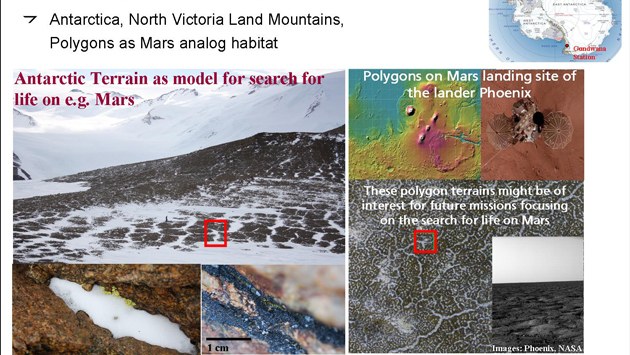 Wir sind also daran interessiert, auf der Erde zu lernen, wie man Eis- von Sandkeilpolygonen in Luftbildern unterscheidet, denn in der Marsgeologie sind wir hauptsächlich auf die Analyse von Satellitenaufnahmen angewiesen und haben keine Möglichkeit, vor Ort zu arbeiten. Die Antarktis ist ideal für derartige Mars-Analogiestudien auf der Erde, denn moderne (also derzeit entstehende) Sandkeilpolygone gibt es nur in der Antarktis. Von den Helliwell Hills sind keine detaillierten Berichte von Frostmusterböden in der Literatur vorhanden, weswegen wir hier Neuland betreten. Genauer gesagt müsste es allerdings lauten "ergraben", denn die Untersuchung von derartigen Böden erfordert, sich den Untergrund anzusehen.