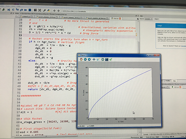 Passenderweise probiere ich mich aktuell daran, den Aufstieg einer Vega-Rakete mit dem Computer zu simulieren. Im Januar begrüße ich nämlich wieder Schülerpraktikanten bei uns in der Abteilung. Sie sollen dann vergleichen, wie weit Wirklichkeit und Simulation auseinander liegen, indem sie die berechnete Flugbahn einer Rakete mit der echten Flugbahn vergleichen. Aber das nur am Rande.