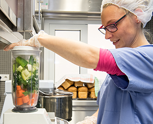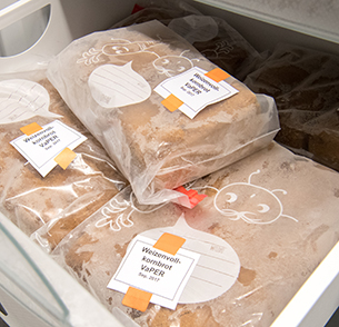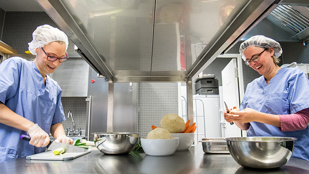 14:00 Uhr: Nun kommt der Küchen-Spätdienst. Die Übergabe zwischen Früh- und Spätdienst erfolgt mündlich und gemeinsam wird mit den Vorbereitungen für die anstehenden Mahlzeiten fortgefahren, bis der Frühdienst gegen 14.30 Uhr seinen Feierabend antritt. Der Spätdienst beginnt nun auch schon mit Vorbereitungen für den nächsten Tag wie Auftauen und Schnibbeln unterschiedlicher Lebensmittel und natürlich immer wieder Abwiegen. Alles wird selbst zubereitet und teilweise eingefroren: Brot und Waffeln, Gemüsepasten, Bratensoßen, Pesto, Müslikekse und Kartoffelpüree. Dabei muss stets die Uhr im Blick bleiben, damit auch die anstehenden Mahlzeiten wie der Nachmittagssnack, der auch schon mal aus einem Saft oder Smoothie besteht, und das Abendessen rechtzeitig zubereitet sind.